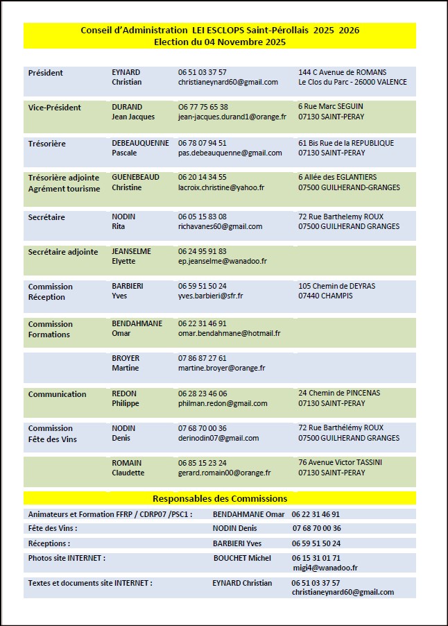 Liste des membres du conseil d’administration et des commissions de l’association LEI ESCLOPS ST PEROLLAIS, pour la saison 2025 / 2026 (élection du 4 Novembre 2025) Retrouvez la liste et les coordonnées de nos Animateurs en cliquant ici
