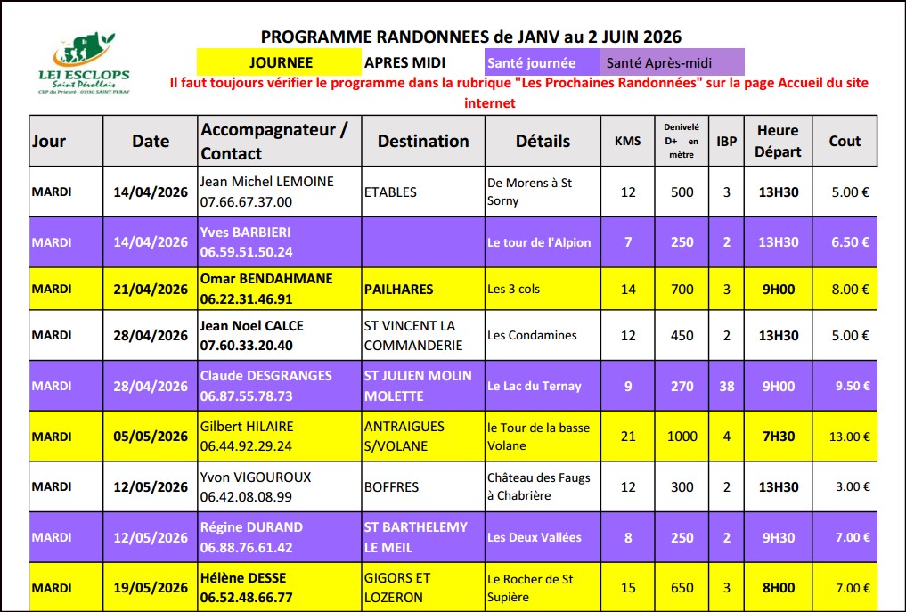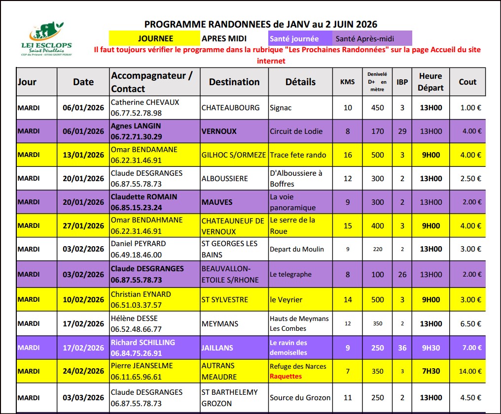 Les randonnées proposées du mardi sont en alternance semaine avec soit une après-midi soit une journée.